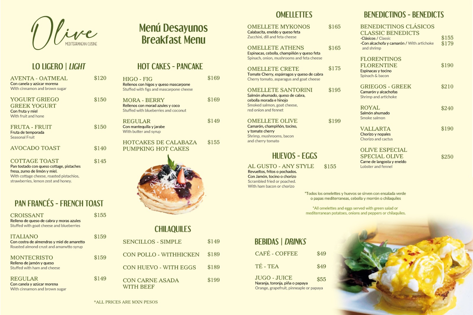 Olive is excited to announce our new brunch menu featuring Mediterranean favorites. Enjoy classic falafel served with tabule, or a chicken or pork gyro with a fresh Greek salad. Our rice pilaf with shrimp is another delicious option. Brunch is available at 195 pesos. Call 322 146 8783 for reservations.